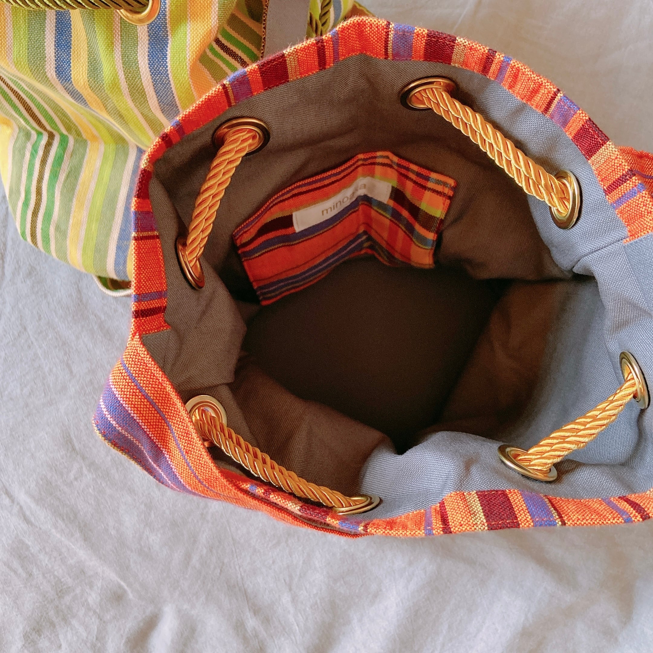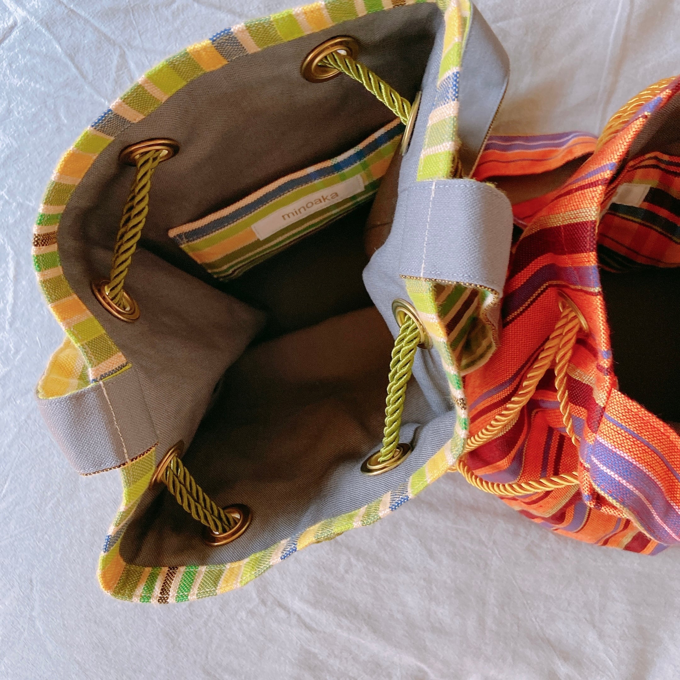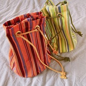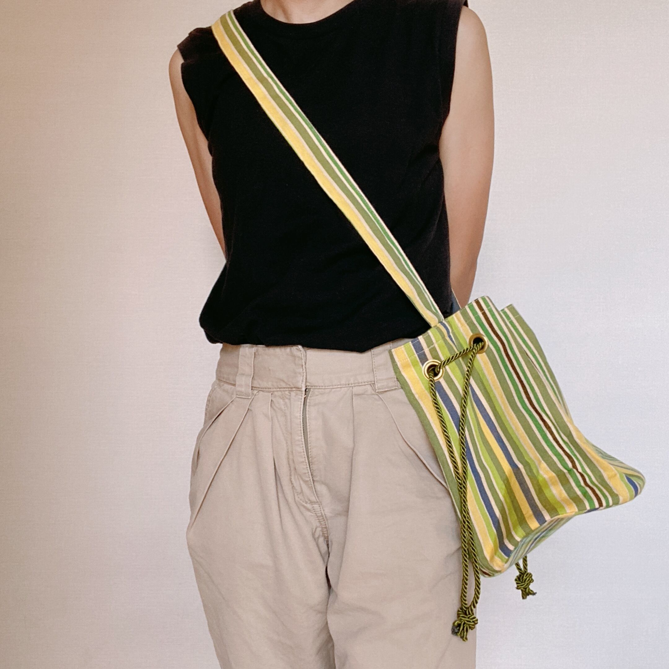 アフリカ布キコイ丸底巾着ショルダーバッグをつくりました。こちらはイエローグリーンの商品ページです。