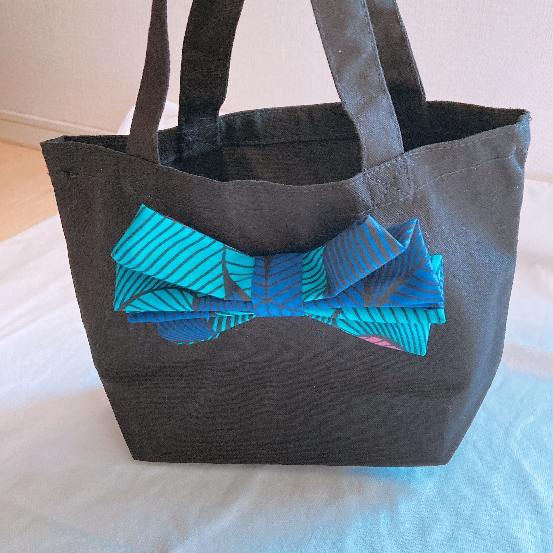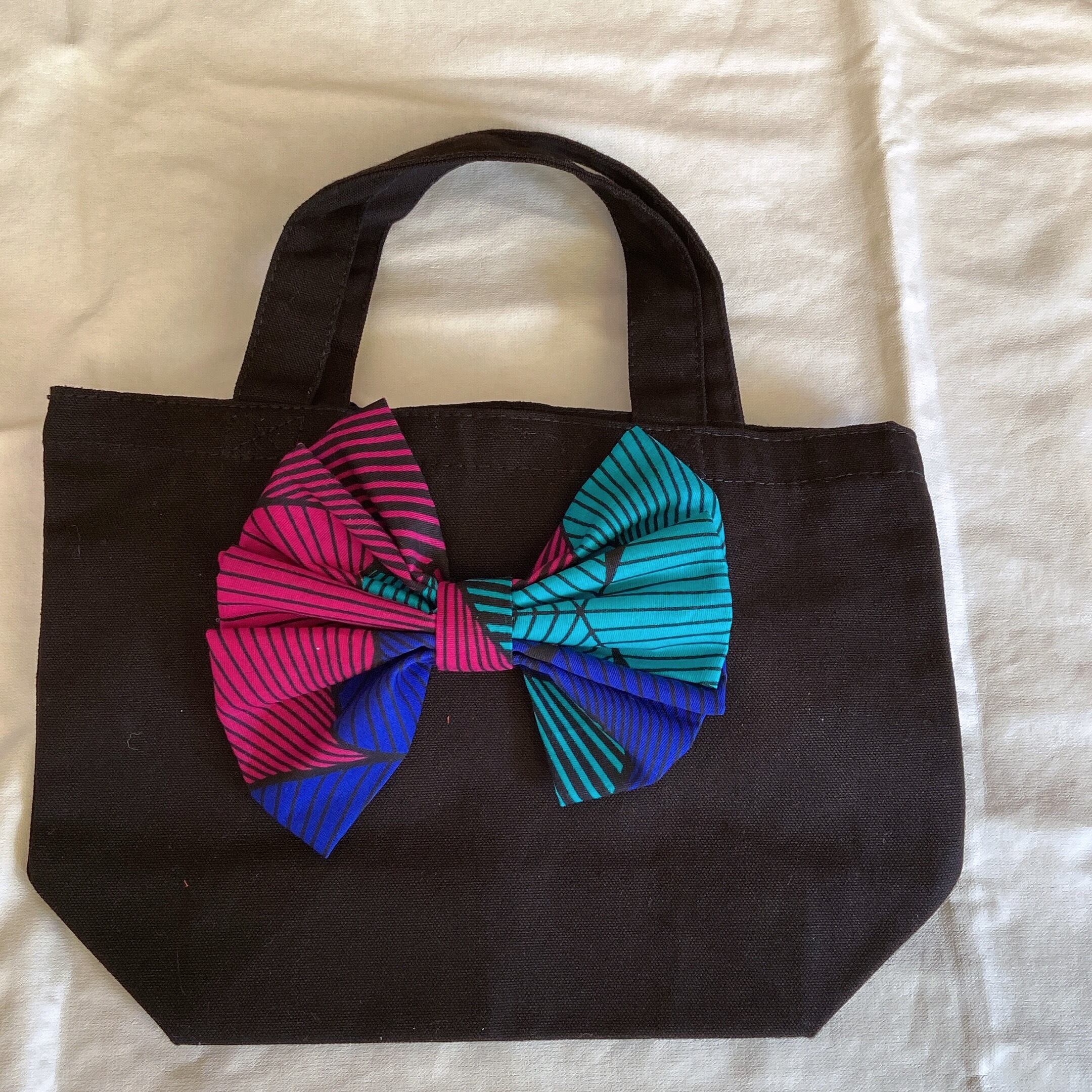 アフリカ布のワックスプリントを使用してリボンを作りミニトートの両面におつけしました。