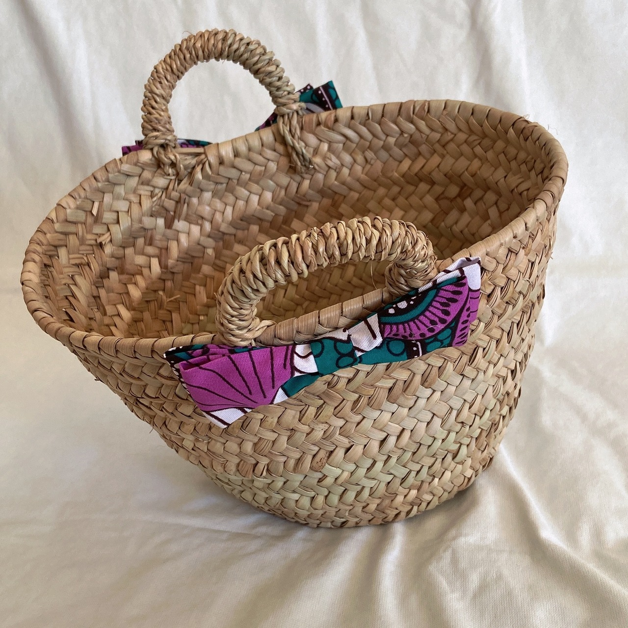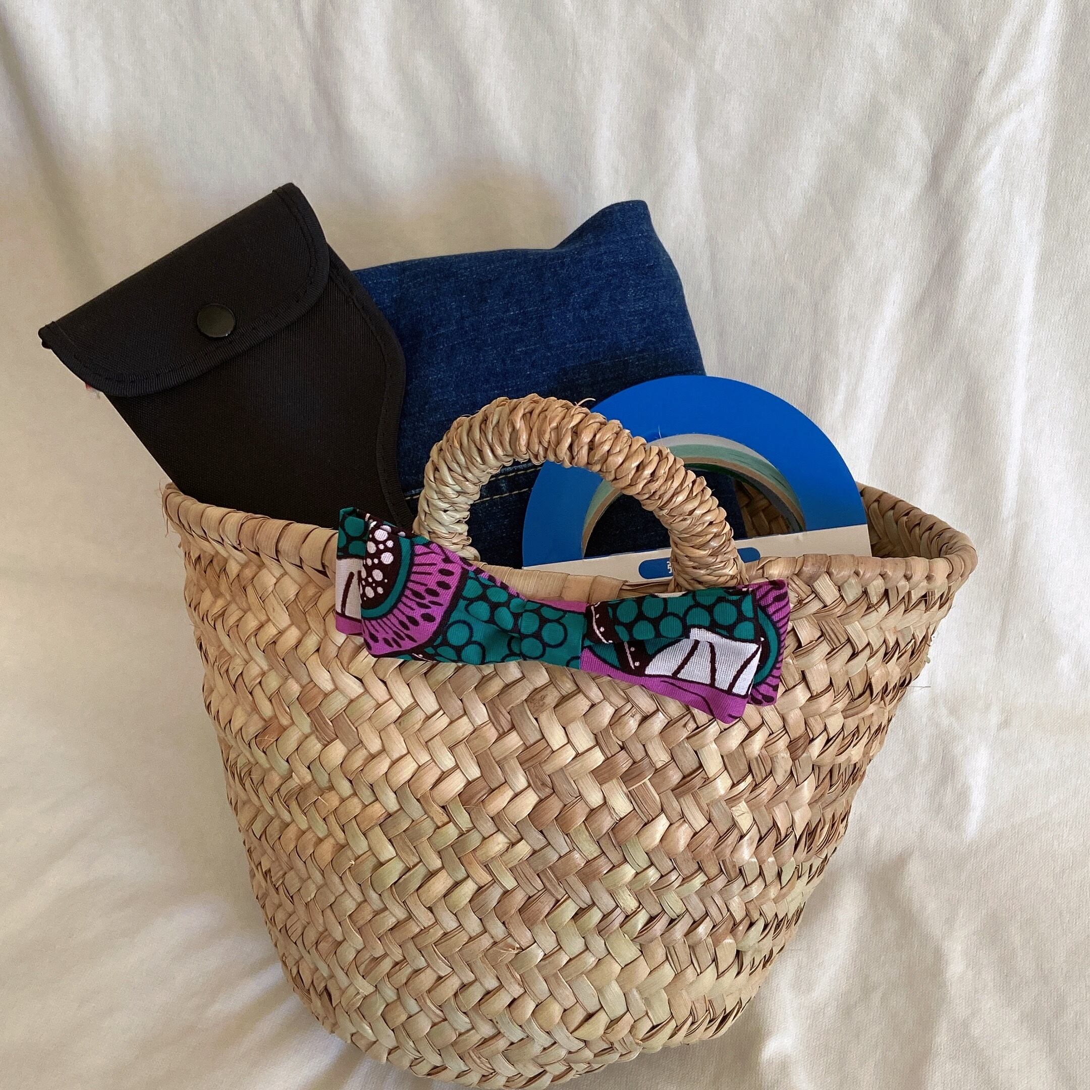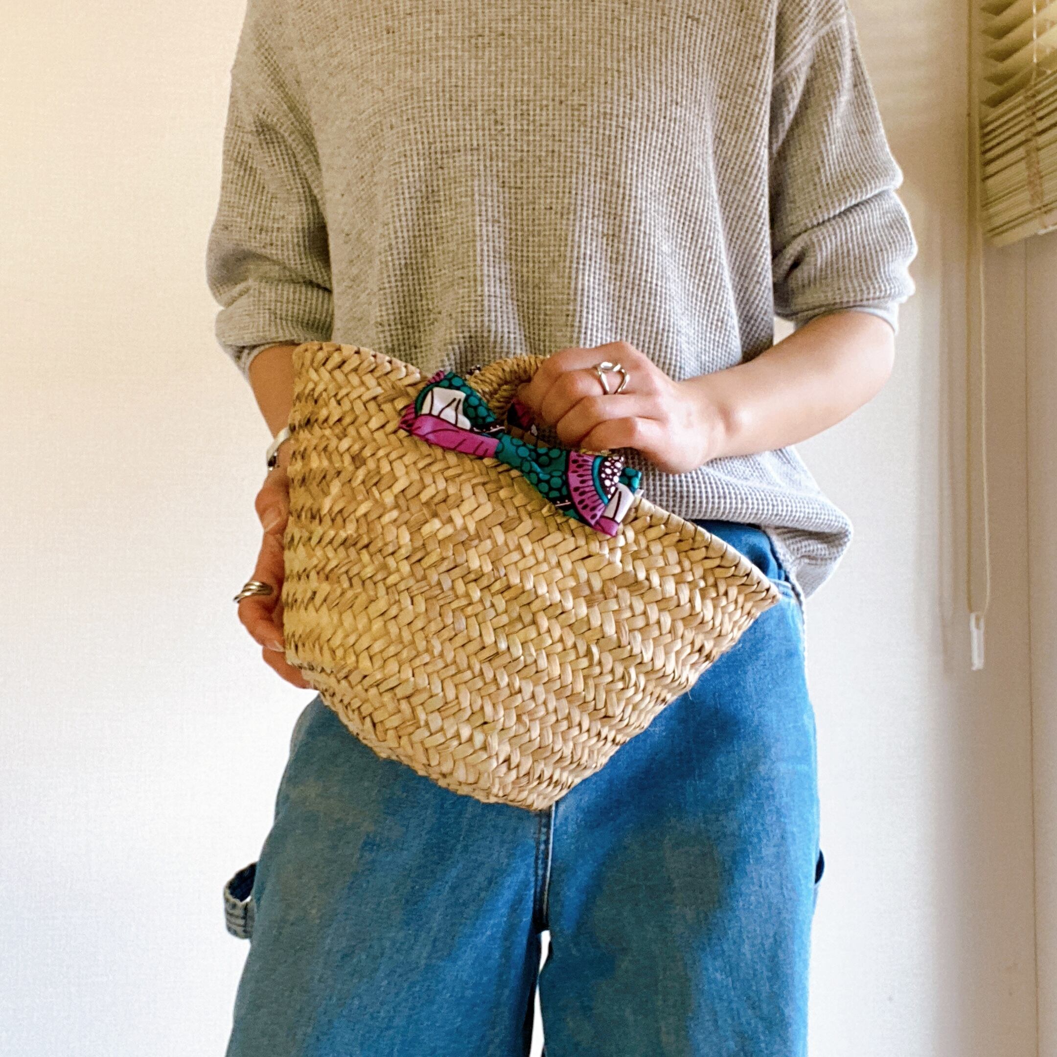 繊細な手仕事で作られたアフリカンプリント生地とナチュラルな素材感のカゴバッグが登場しました。大人気のアフリカンプリントを使ったリボンがアクセントで、個性的なカゴバッグに仕上がっています。小物入れや、インテリアとしても使えるので、お部屋のアクセントにもなりますよ。